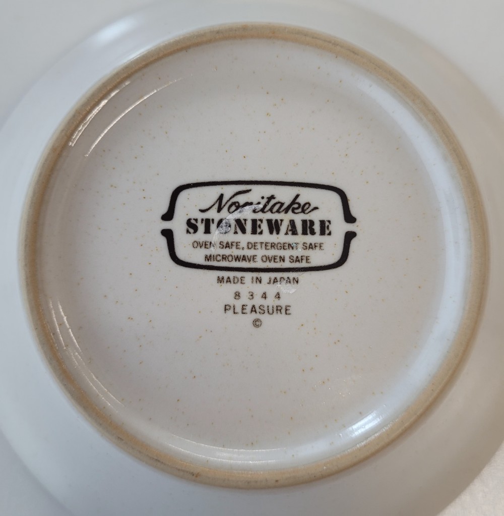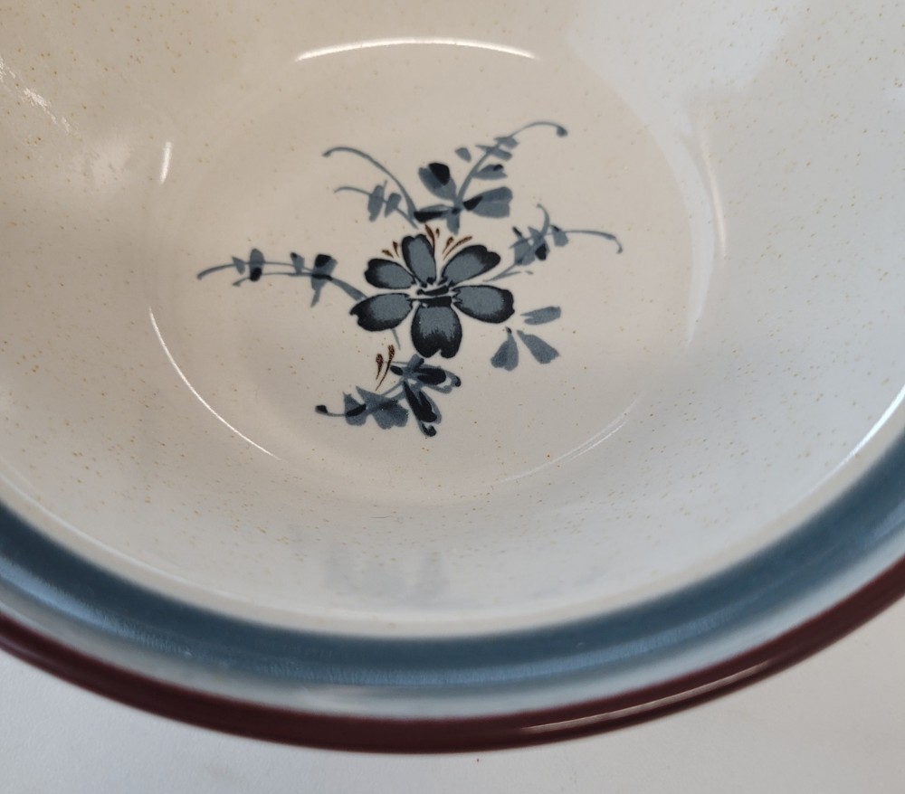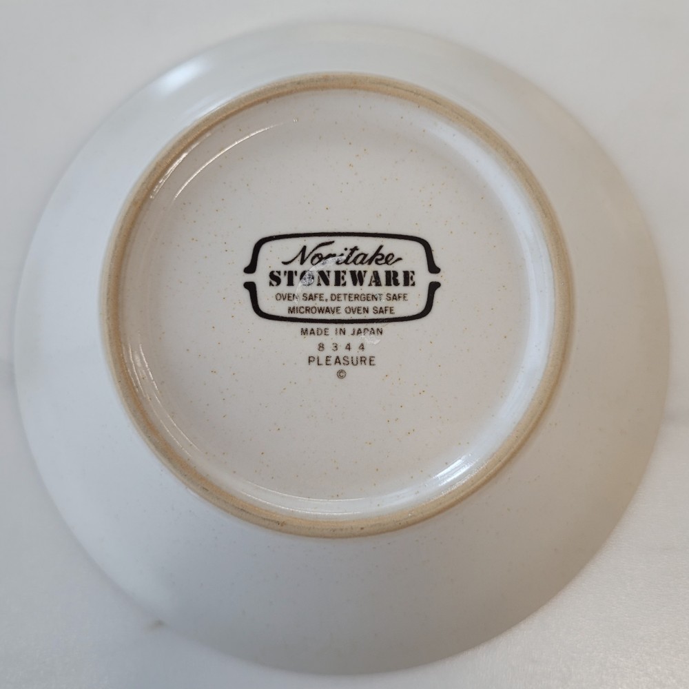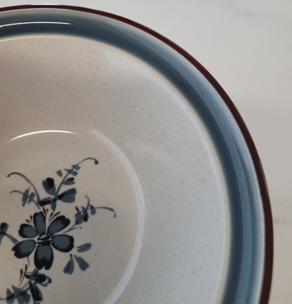 Vintage 1979-1988 Noritake Stoneware bowl, pattern- Pleasure. Creamy colored base with faint speckles stoneware bowl with blue and brown accents. Very good condition, minor wear appropriate for age in bottom of bowl. No chips, cracks, or crazing. =%