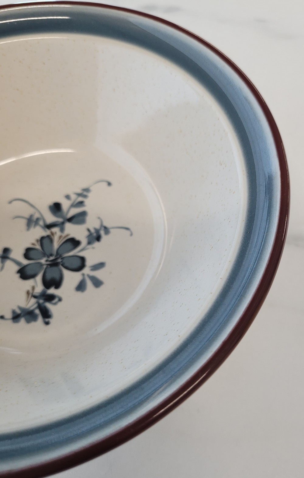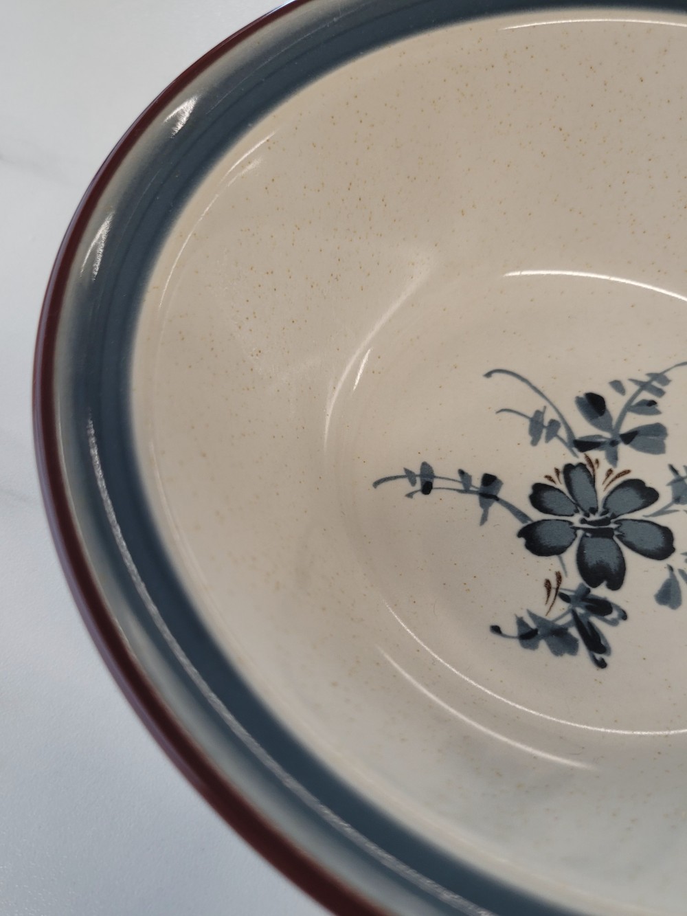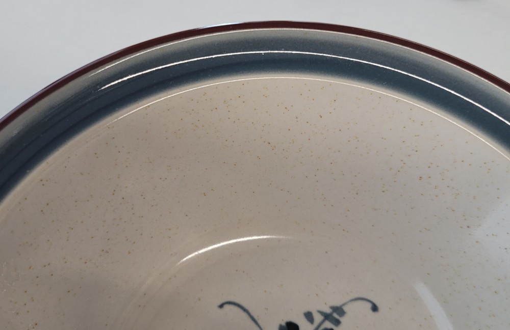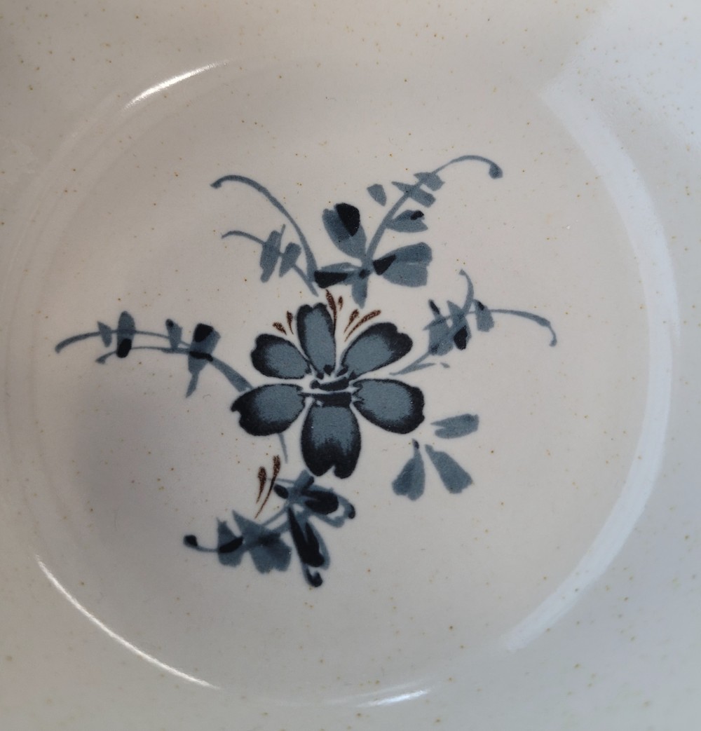 Vintage 1979-1988 Noritake Stoneware bowl, pattern- Pleasure. Creamy colored base with faint speckles stoneware bowl with blue and brown accents. Very good condition, minor wear appropriate for age in bottom of bowl. No chips, cracks, or crazing. =%